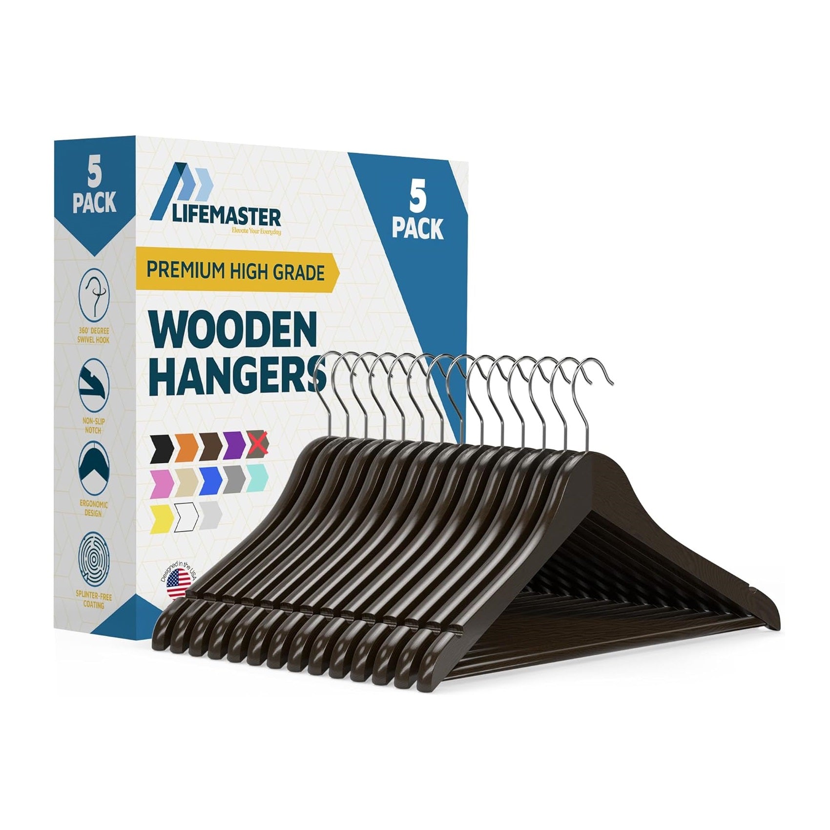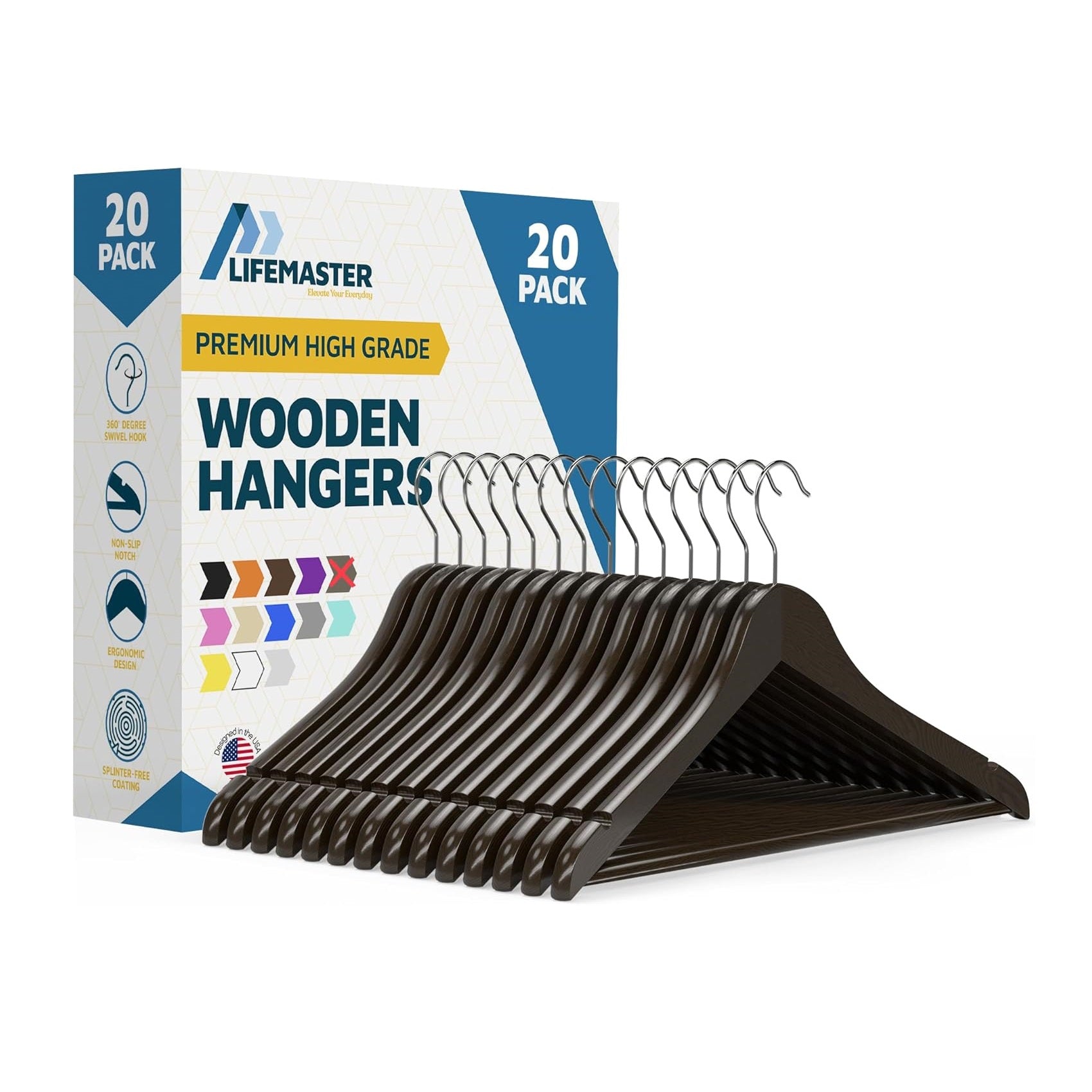Elevate your closet organization with LifeMaster's Vintage Wooden Hangers Set, blending functionality with timeless elegance. Crafted in a rich vintage color with a natural wood grain finish, these hangers not only add a touch of sophistication to your closet but also ensure durability and longevity. Designed with specialized notches, they securely hold a variety of garments, from delicate camisoles to tailored jackets, ensuring they remain wrinkle-free and impeccably organized. Experience convenience with the integrated chrome 360° swivel hook, providing a frustration-free hanging experience and effortless accessibility to your wardrobe. The sleek design and smooth finish optimize your closet space, maintaining a clutter-free environment while enhancing its overall aesthetic appeal. With a solid wood construction and a thickness of 0.47 inches, LifeMaster guarantees a heavy-duty coat hanger set that meets your storage needs while preserving the shape and integrity of your clothing collection. Transform your closet with this comprehensive hanger set, combining style, durability, and functionality for an unparalleled wardrobe experience.
